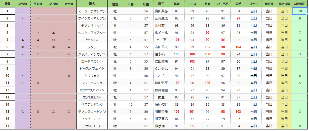 マイルチャンピオンシップ (GI) 総合指数表(前日)