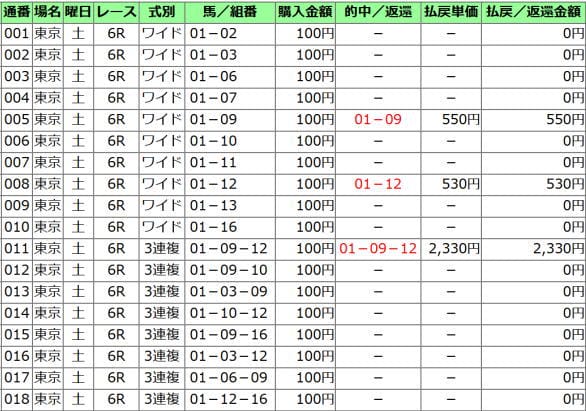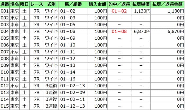 こちらは馬連での勝負と、ワイドと重複的中を狙った結果。